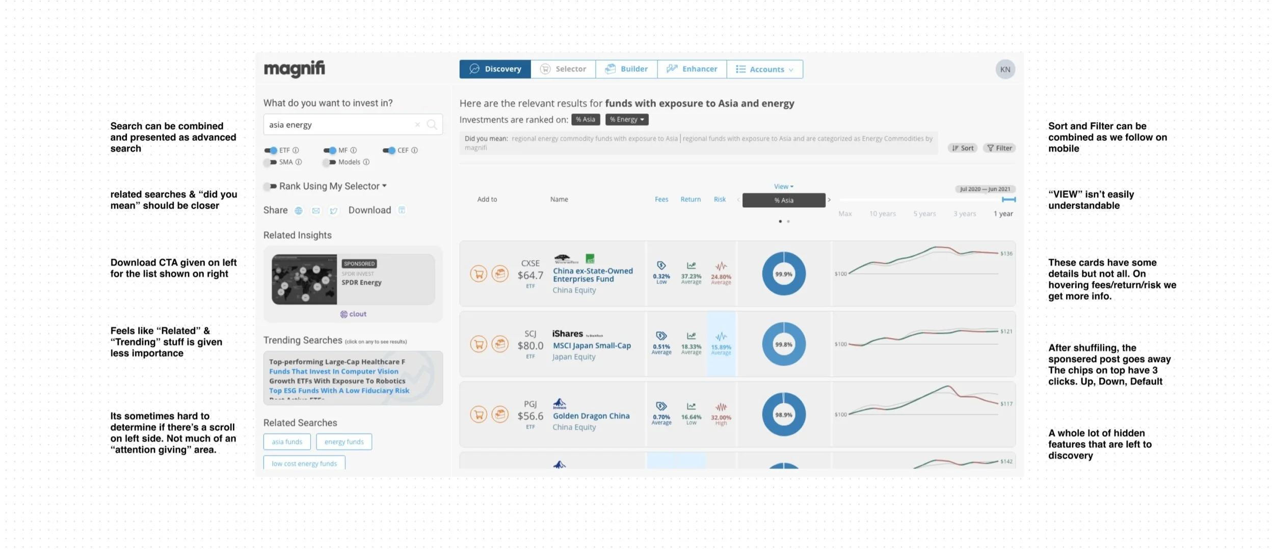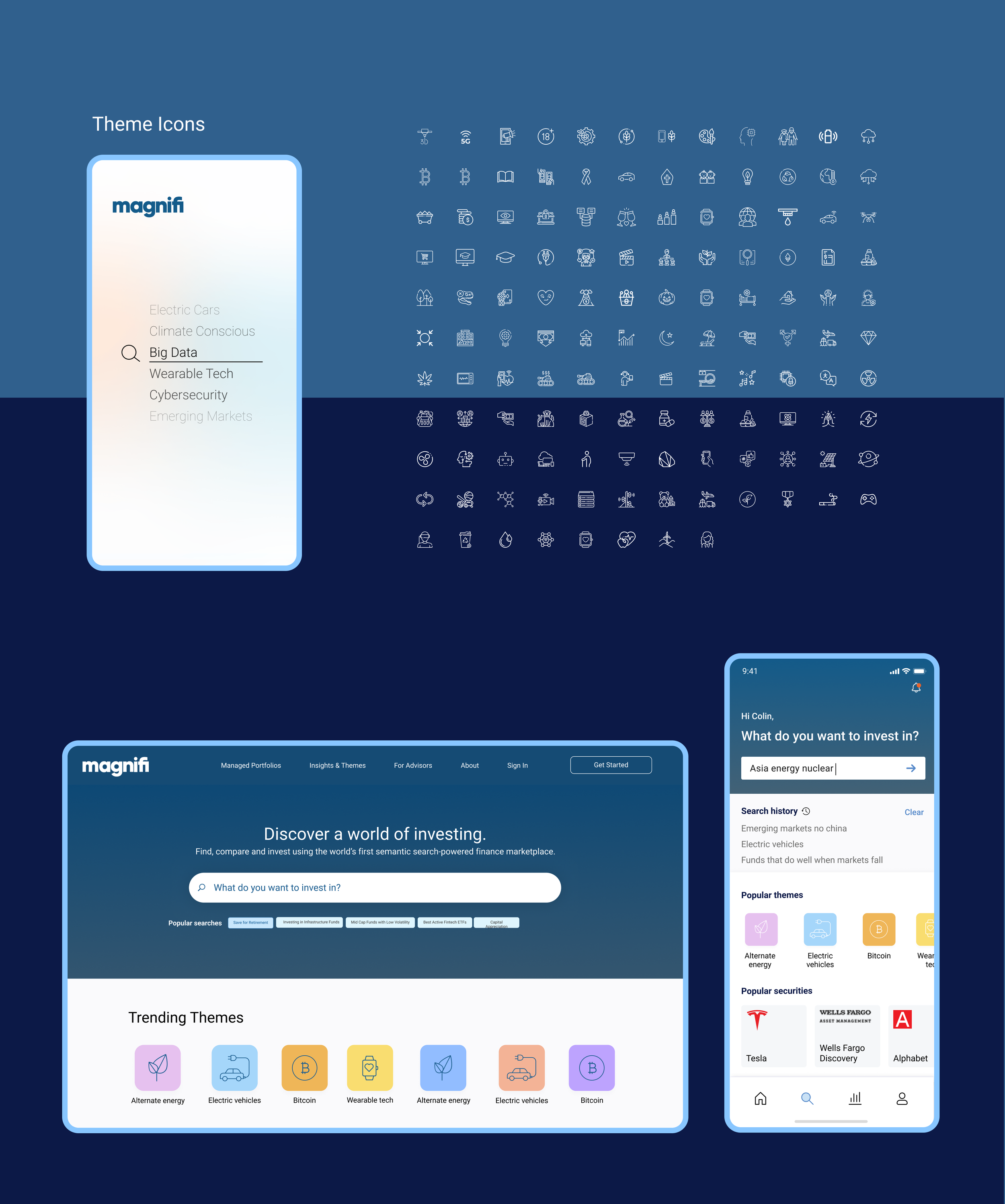 We performed a comparative analysis of prominent retail trading apps, including Robinhood, Ameritrade, and WeBull. A standout element we identified was Magnifi's distinctive theme-based search. To make the tool more approachable for curious investors those with less experience, we paired the natural language search with a visual guide to the available categories.