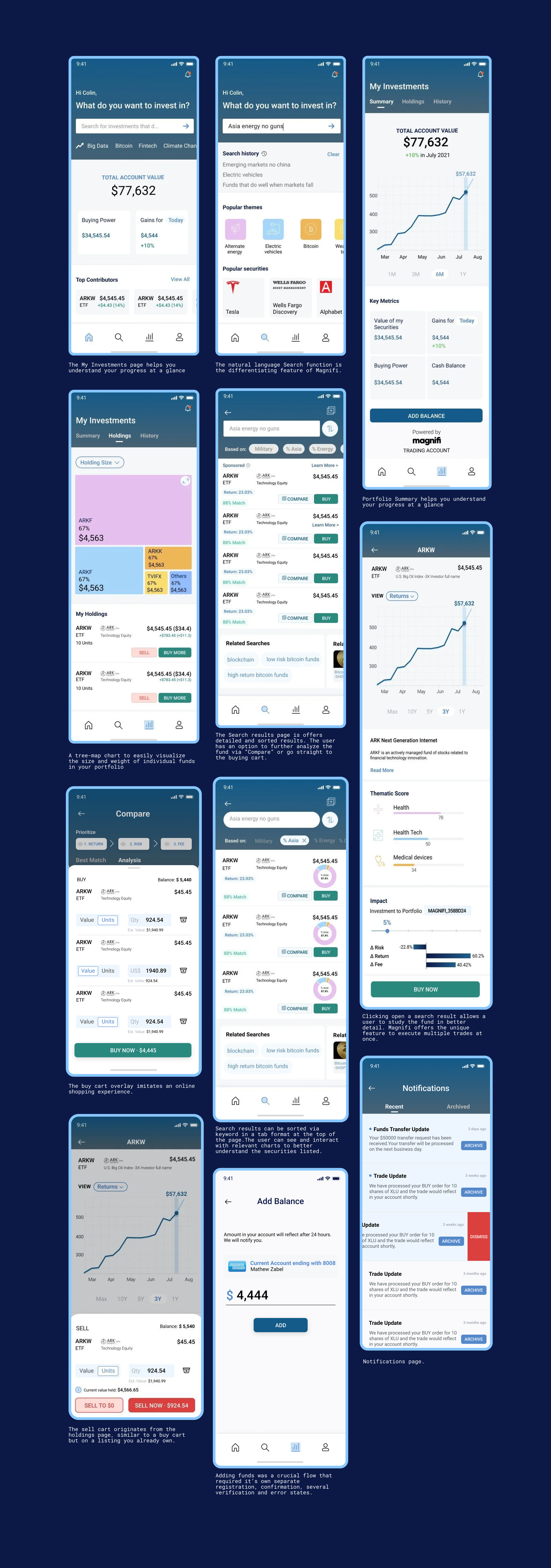 A quick look at the basic functionality of the entire app. The largest differentiator between Magnifi and other trading apps is the ability to create your own basket of funds. Typically, a broker or fund manager would create one for you. But with Magnifi, retail investors can make their own informed decisions. The basket of funds offers a cart-like experience, similar to what's seen in an e-commerce checkout. This was intentionally included to leverage familiar user experience patterns.
