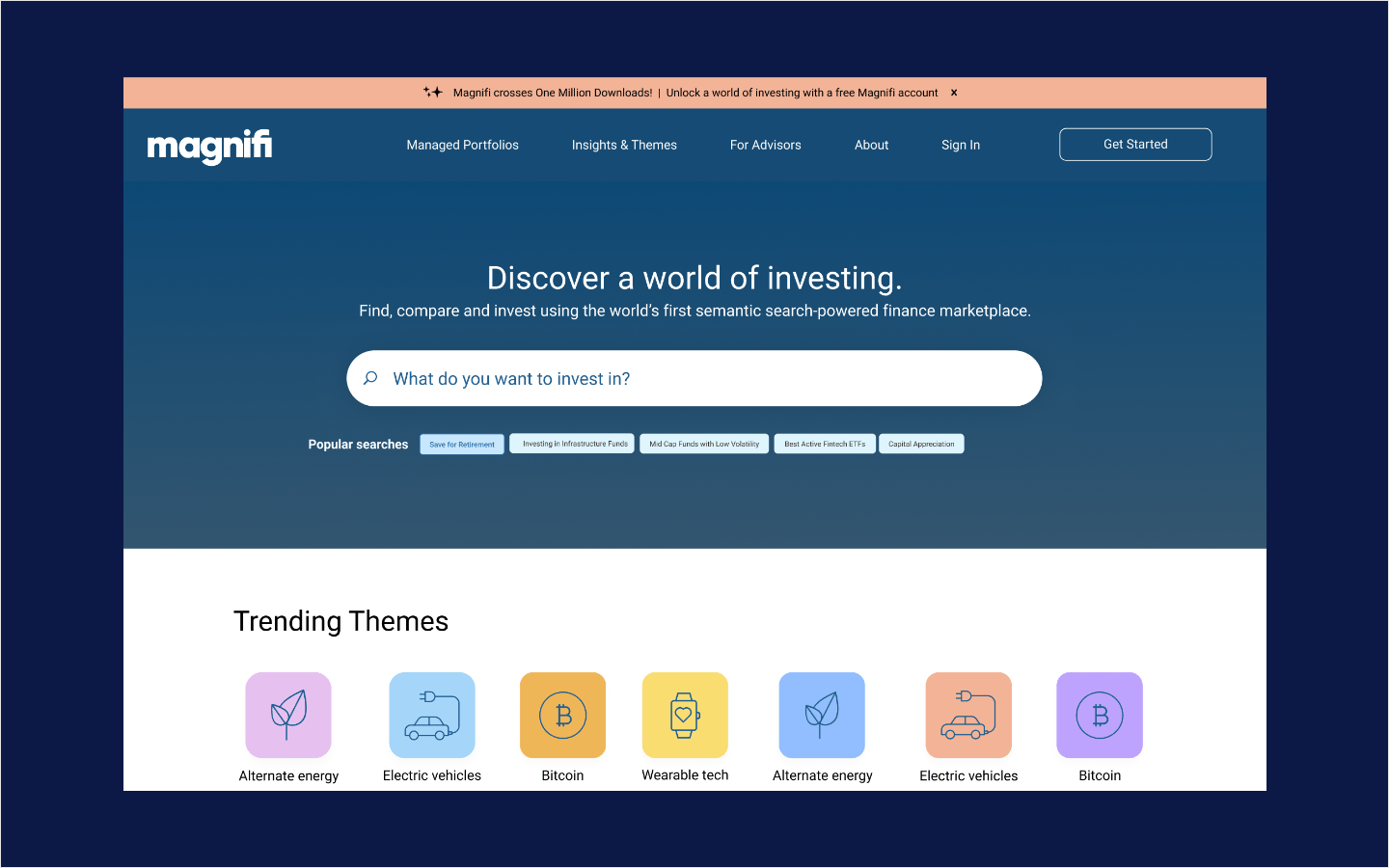 Magnifi is a trading app that makes helps retail investors gain access to analytical capabilities that help them shop for investments. The companion Magnifi web platform was built primarily for financial advisors, the app was created to bring this analytical advantage to the masses.