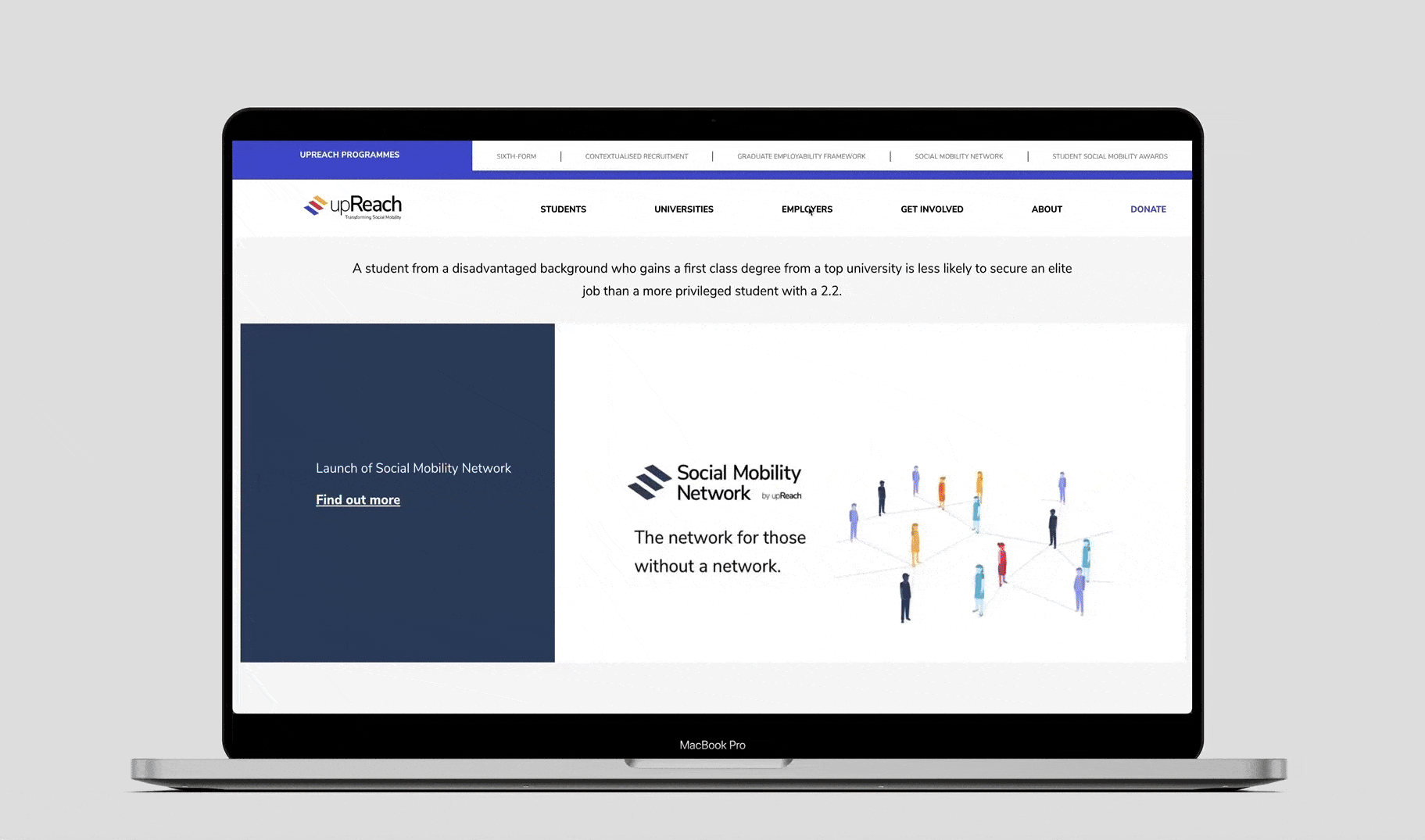 We aimed to make it clear that everyone is welcome at upReach. Students, parents, universities, scholarships, professors, and employers all contribute to the overall success of this organisation. We tried to use diverse imagery and create a neutral, timeless solution. A website that can stand the test of time.
