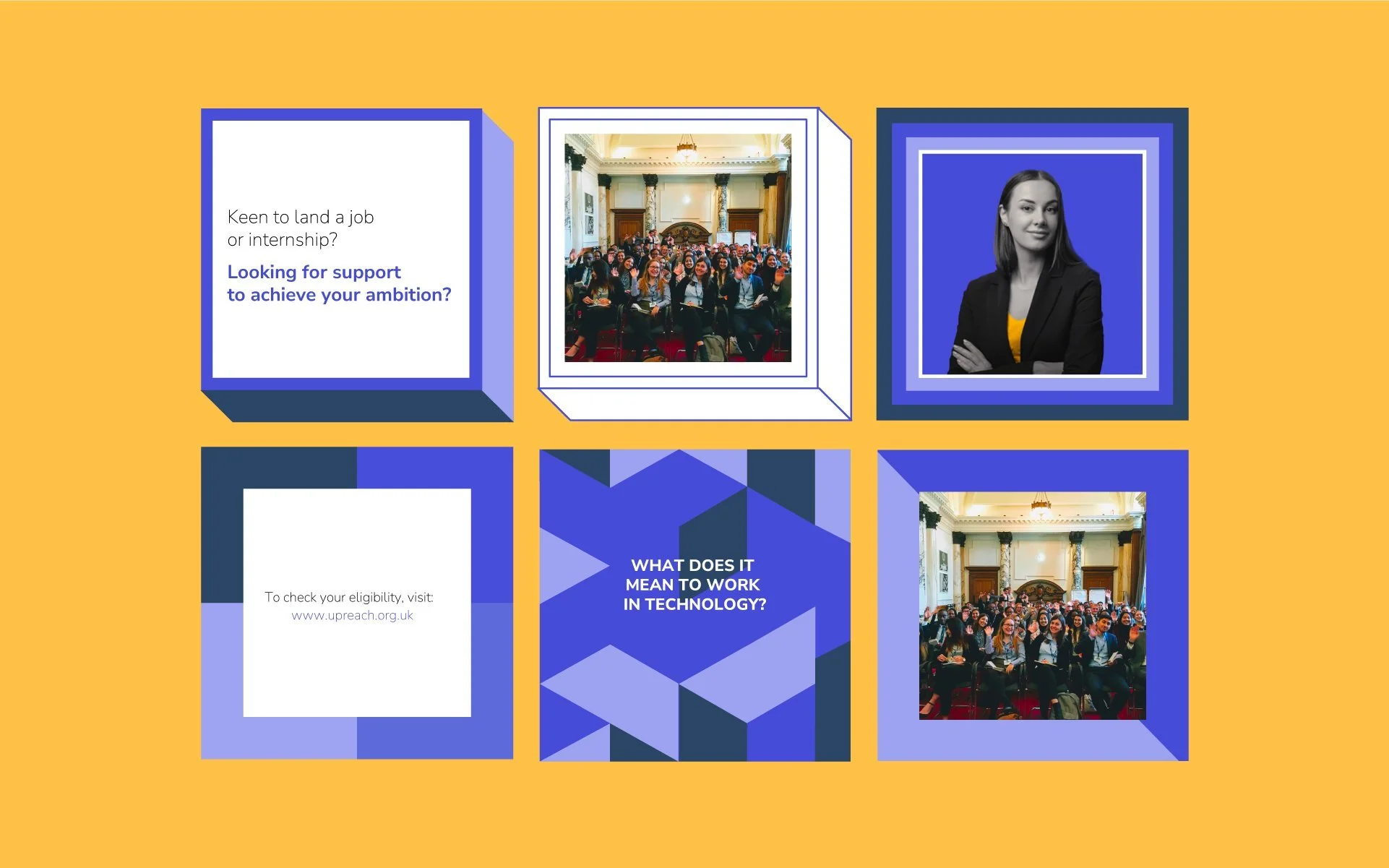 The family of logos draws from the steps a student will take on their journey to a successful career, capturing upReach’s role to support students from lower socioeconomic backgrounds. An updated colour palette allows the staircase design to be used across upReach’s extended system.