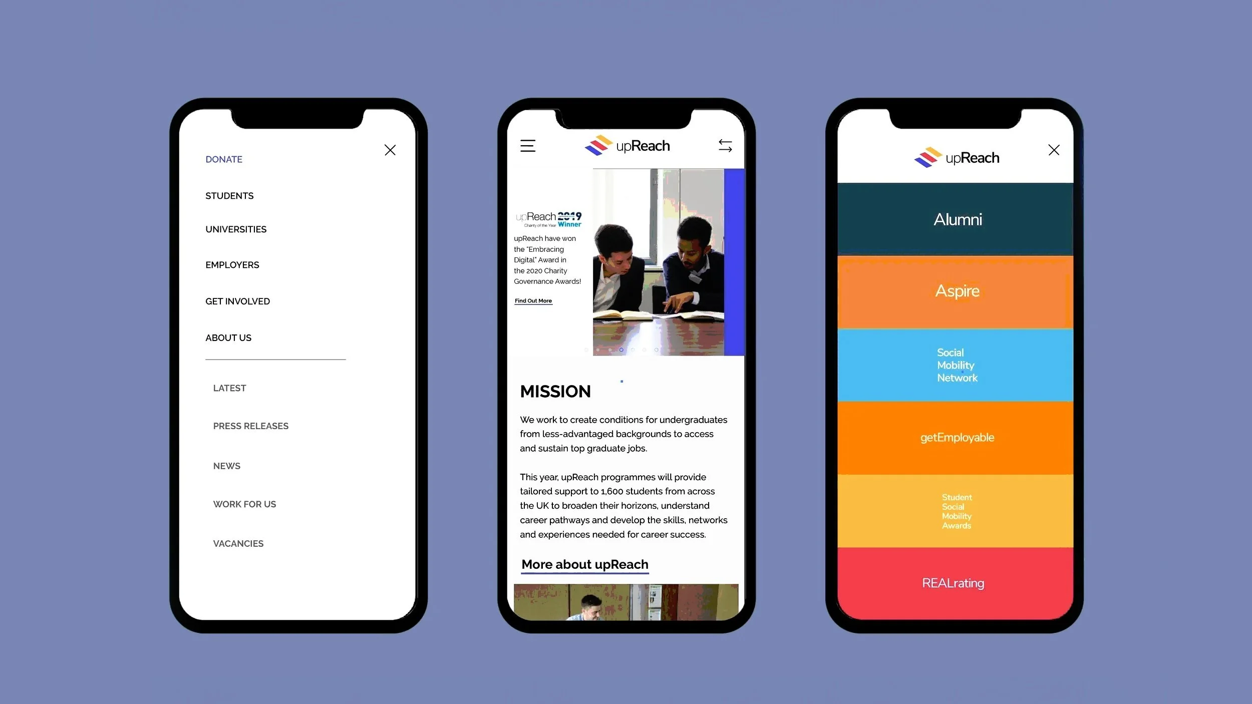 Glancability was a key goal due to the website being so information-rich. This proved to be a particular challenge on the mobile site due to the dearth of real estate on such a small screen. We highlighted the nested navigation as a full-screen dropdown menu that appears on every upReach website, which sits opposite the regular hamburger menu.